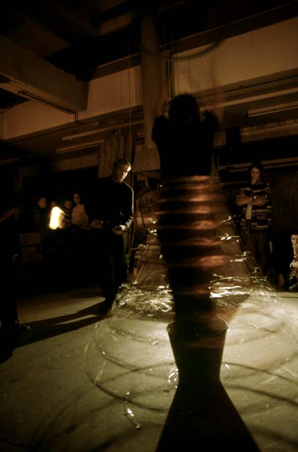In the show the crinoline was exhibited "finished," covered with glass thread. Next to the crinoline a video showed the performance, edited in a endless loop.