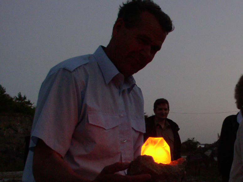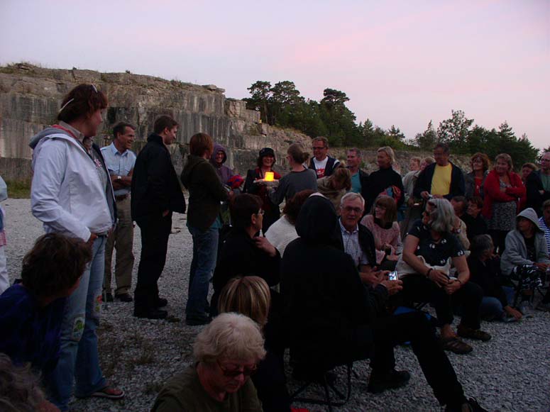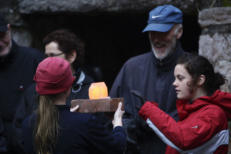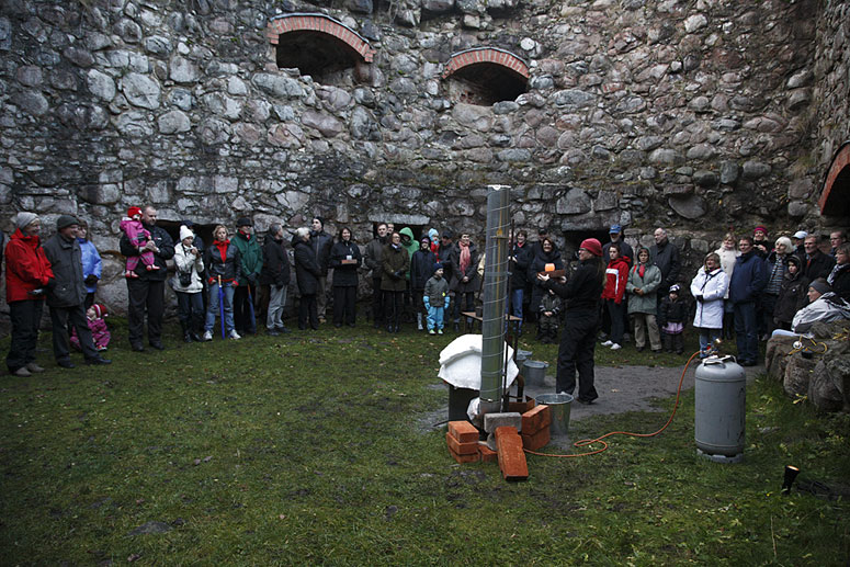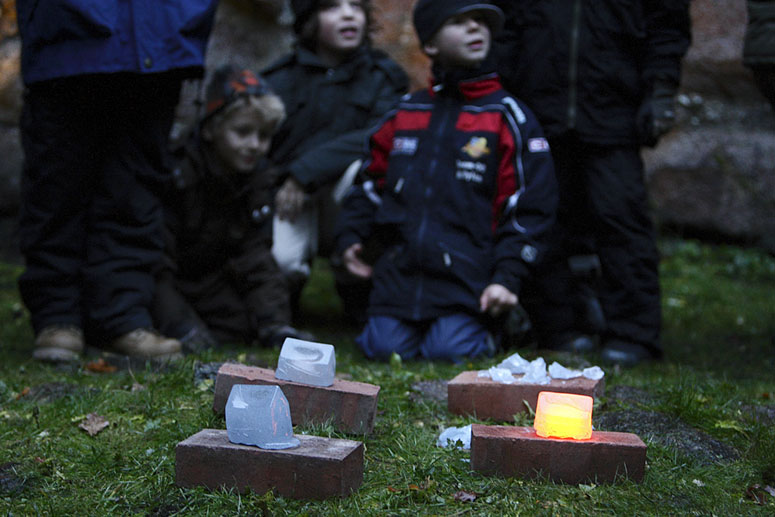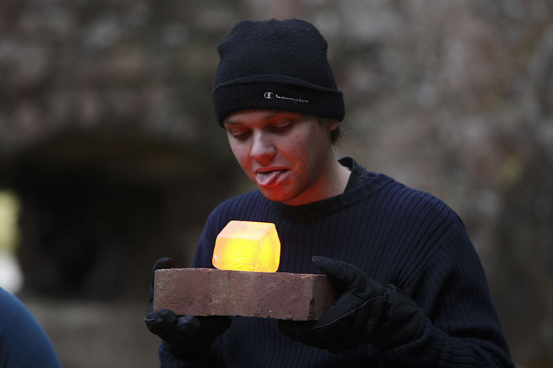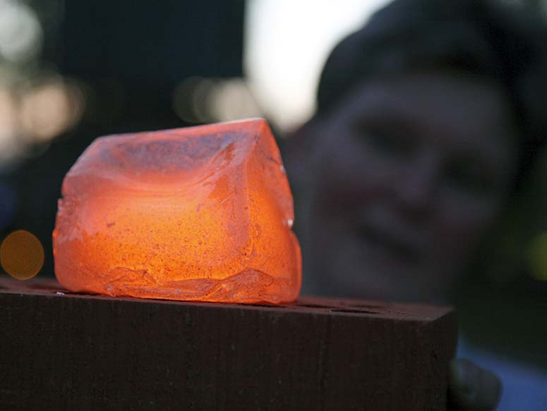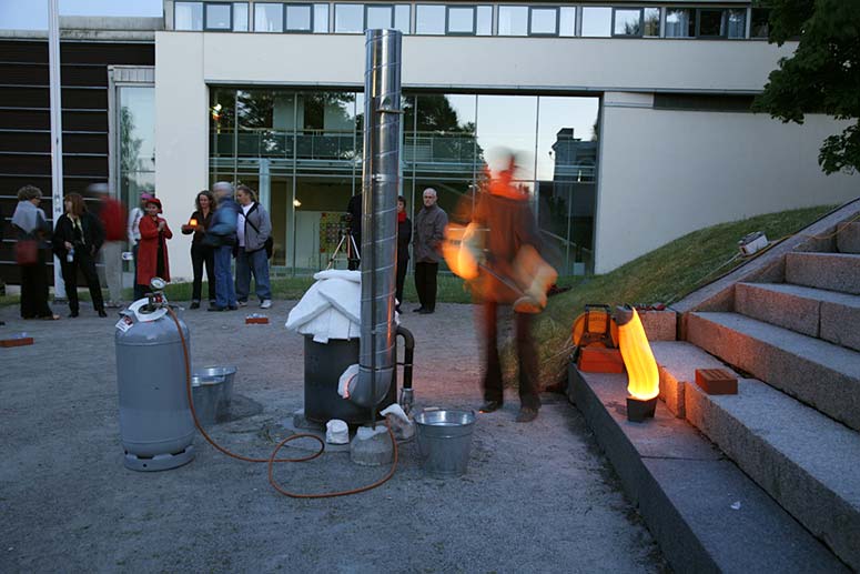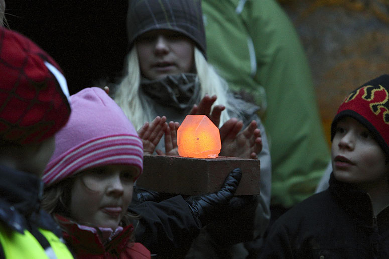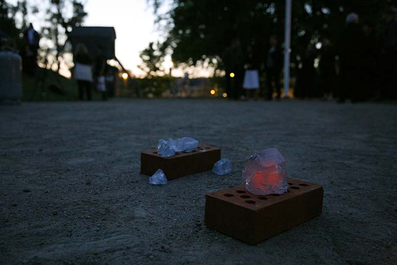 The houses first glow bright yellow from the core of hot glass. Slowly the color change from orange into a dark red and finally it looses the glow and become clear. After about 10 – 25 minutes the houses explode with a load noise releasing the tension and anticipation in the audience. The performance lasts for about 45 minutes during which 14 houses are given out and the discussion and participation gets louder and more involved. The performance is held at sunset at (different time depending on the season) and the glass glows more orange as the sky gets darker.