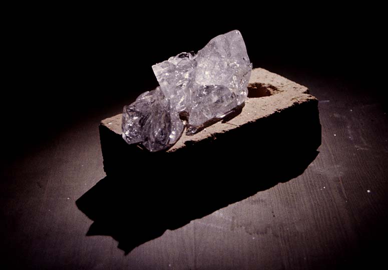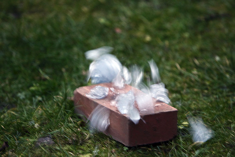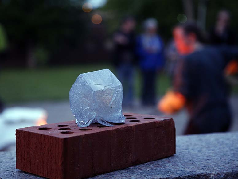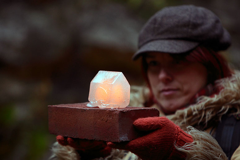 During the performance I pour 1200°C hot glass into an iron mould and cast glass houses, which are placed on a brick or a stone and handed out to the audience. After giving away the first house I declare; This house will explode in seventeen minutes, setting up a tension by the fact that someone is given a present with a literal expiration. While I continued casting and giving away more houses, audience members decide to quickly do away with their house and monitor it from a safe distance.