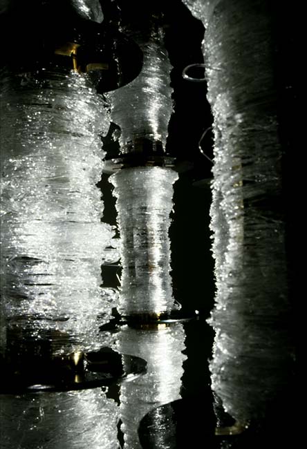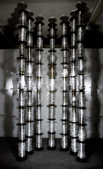 Threads of Life is an imaginary storage of life-threads made from glass spun onto large spools. The 63 spools in the exhibition are stacked from floor to ceiling, with the intention to create a feeling of plenty and the rows of spools are placed in a half circle, as to surround the viewer. The title refers to three sisters featured in Nordic Mythology, spinning the "threads of life," and dictating the life of humans and Gods and determine when everybody will live and die. The installation speaks of the uniqueness of each life in the endless cycle of life and death.
