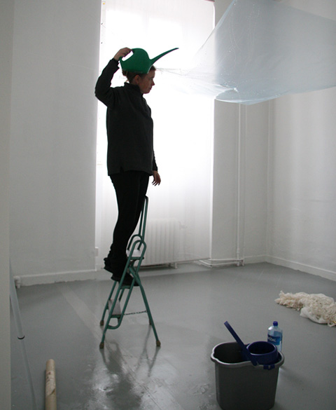 Day one. Putting up a plastic sheet taken from a scene in Tarkovskij's Nostalghia, and attempting to pour water into it. I have not enough wall space to hang it right and me and the floor gets mostly wet. But the little water I managed to stay pools into drops and I am reminded of my endeavor.