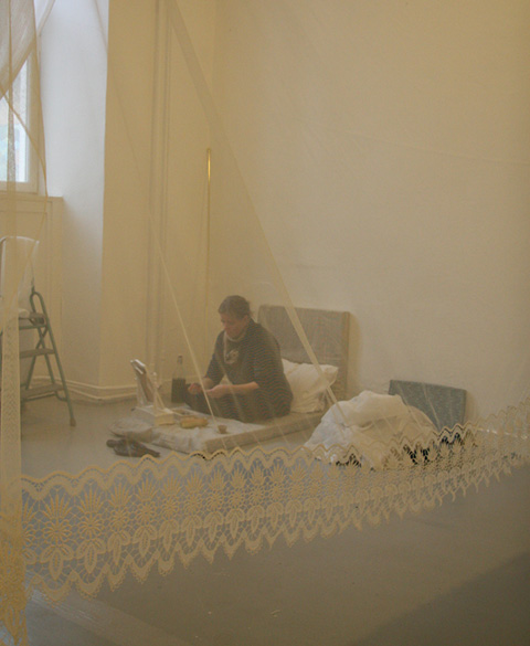 Trying lace curtains but I am not interested in evoking feelings of nostalgia in the installation, I wish visualize the notion.