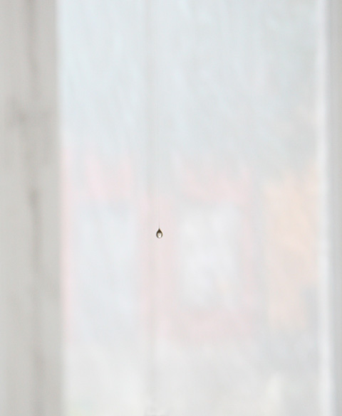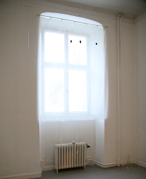 Day three. In the morning I had finally got the idea for the installation. I was going to create a shape of the window in the room by drawing the shape with glass thread. The window shape is suspended above the floor, in front of the real window, thus framing the drops.