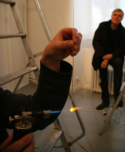 I was nervous about making drops, because it is the speed of my responsiveness that controls the length of the threads that suspends the drop in mid air. Yesterday night I was too tired and burned of the thread and they ended up burning the floor (the glass is about 1100 degrees centigrade when it melts into a drop).