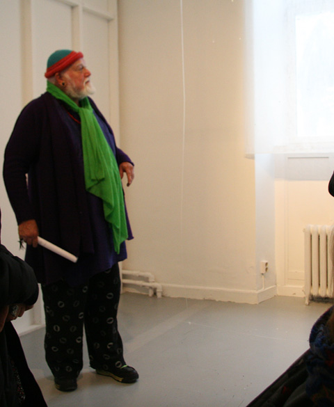 Opening reception. I wear Harriet Löwenhielm's (the older) Konstfack robe I inherited from Harriet L the younger. It is similar to the robe on the poster in the Museum bathroom I have visited frequently during my water fast (I should call it tea fast because the taste of water was often unbearable).